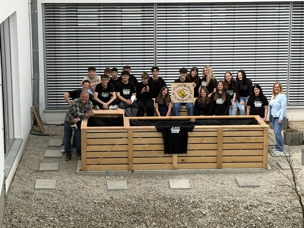 Aufbereitung der bestehenden Holzterrasse durch das Technikteam der 8. und 9. Jahrgangsstufe im Innenhof der Schule, Errichtung eines Kräutergartens in Form eines U-förmigen Hochbeets, Schaffung von Sitzgelegenheiten mit einem Sonnensegel. In den Arbeitsphasen wurden (und werden) wir vom Team "Ernährung und Soziales" (ebenfalls Jahrgangsstufen 8 und 9) wunderbar "verpflegt". Im Laufe des Projekts teilten wir die U-Form in zwei L-Formen (eine Seite Hochbeet, andere Seite Bistro-Theke)
